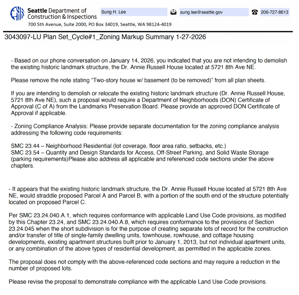 "Based on our phone conversation on January 14, 2026, you indicated that you are not intending to demolish the existing historic landmark structure, the Dr. Annie Russell House located at 5721 8th Ave NE.